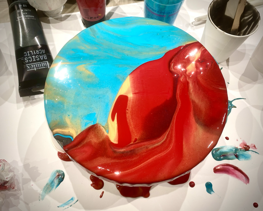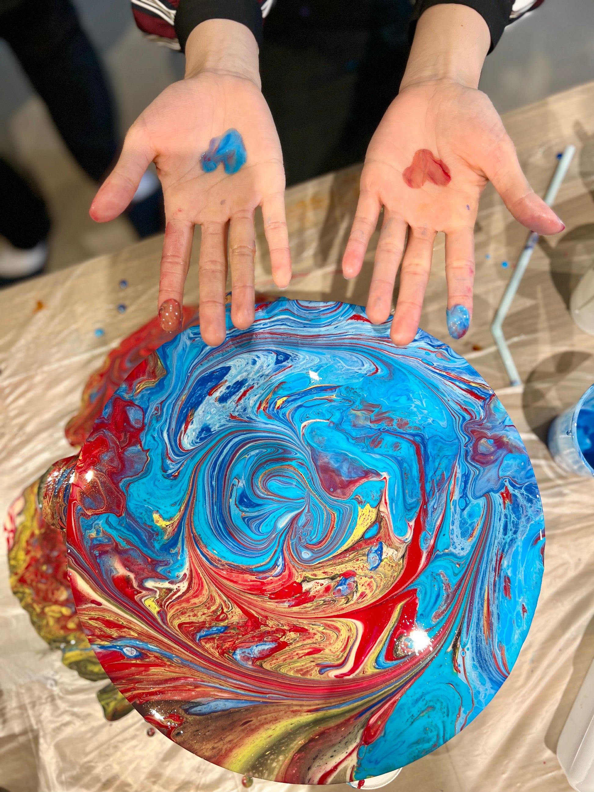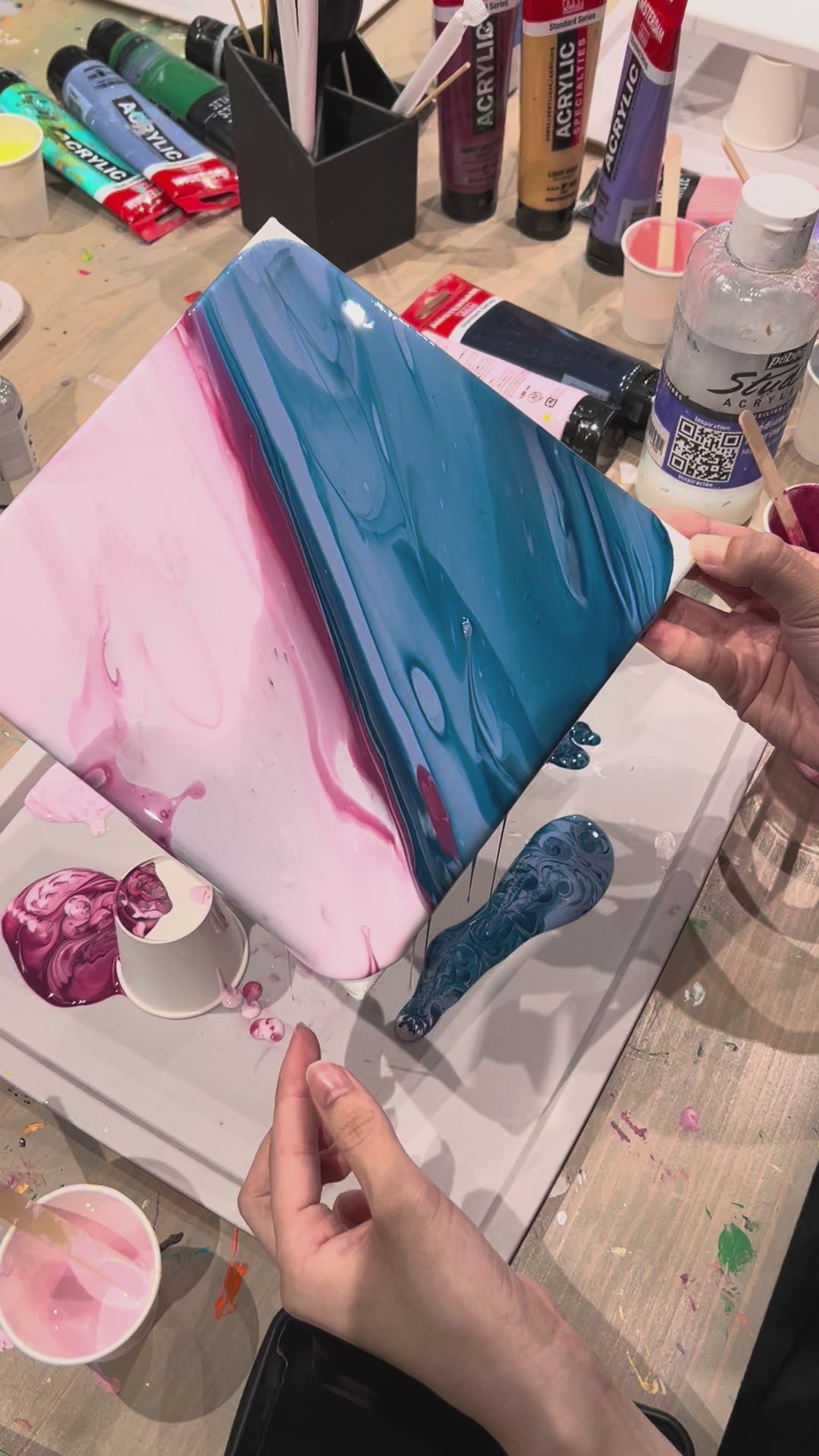 お好きな色を選んでいただき、絵の具を特別な画材と混ぜて液状化します。キャンバスの中でマーブリングさせたり、オイルを使い色を分離させて美しい模様を作っていきます。