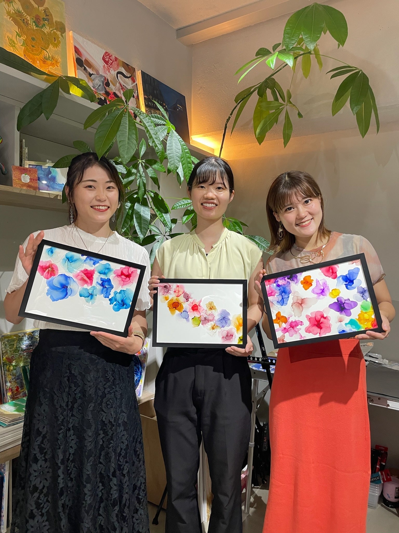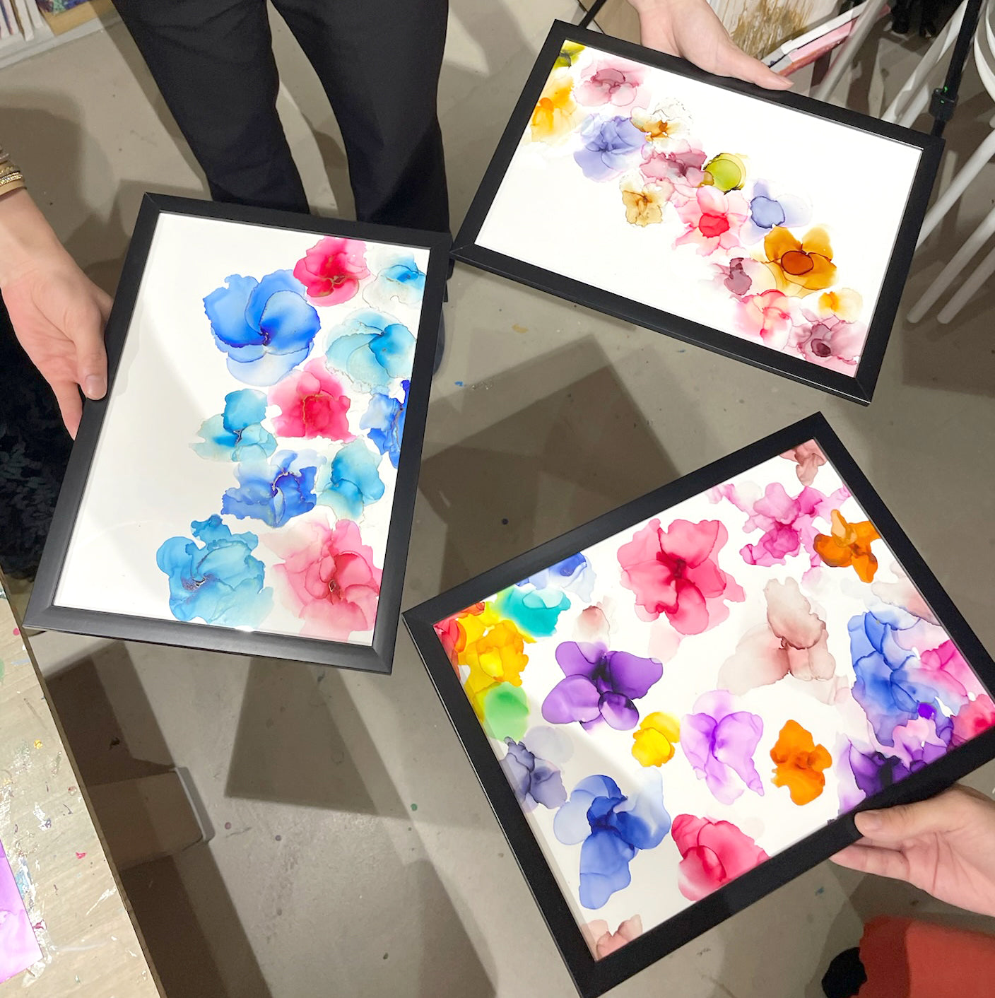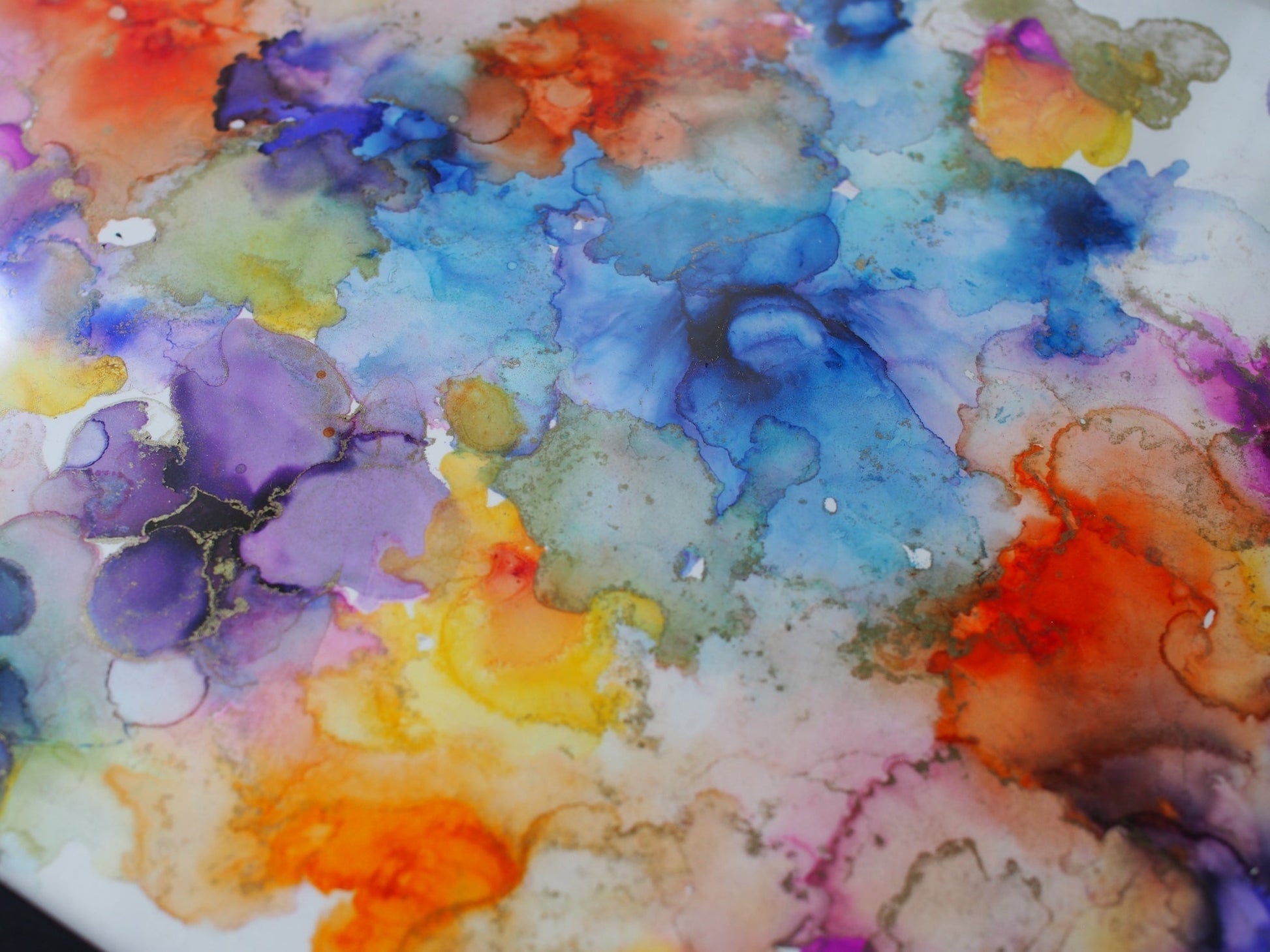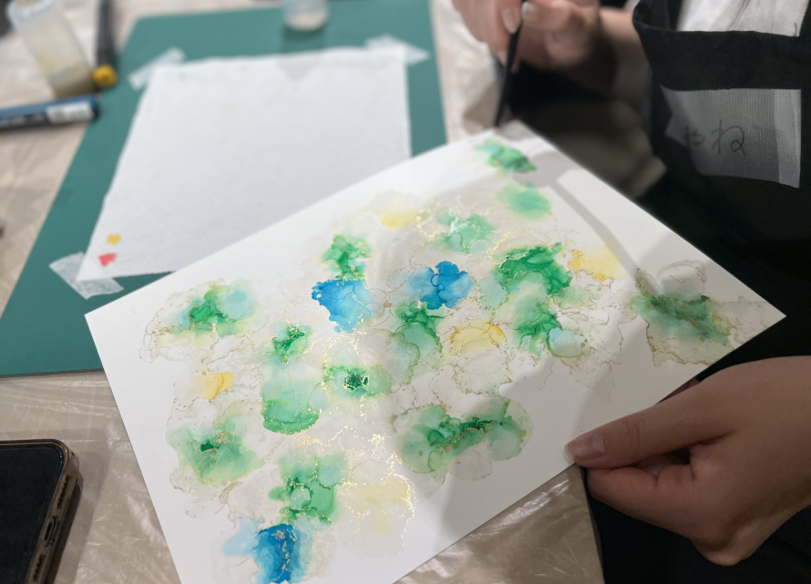 アルコールインクを垂らし、インクの広がりやにじみ、色の混ざり合いから偶然できる模様を楽しむアートです。