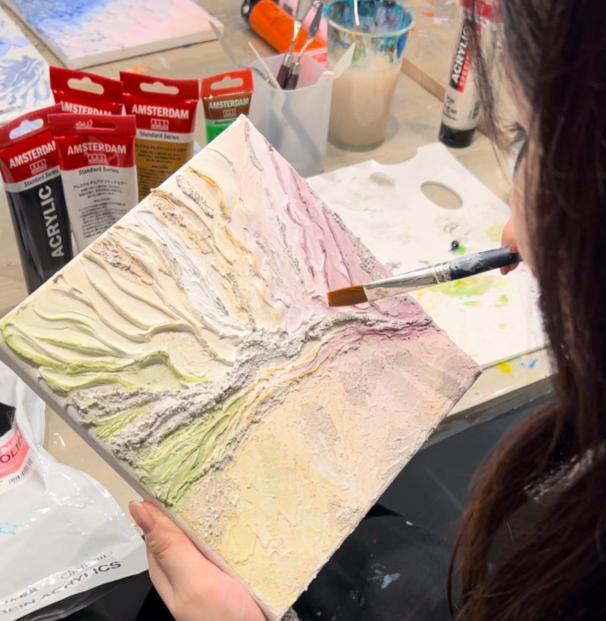 ③絵の具を盛り上げながら立体感や質感のある絵画を描く